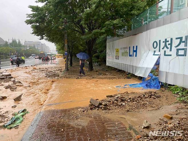 [인천=뉴시스] 이루비 기자 = 호우경보가 내려진 30일 오후 인천 서구 원당동 원당사거리 인근 공사장에서 토사가 도로로 흘러내리고 있다. 행정안전부 중앙재난안전대책본부에 따르면 지난 29일 자정부터 이날 오후 5시까지 인천지역에 누적 212.0㎜의 폭우가 쏟아졌다. 2022.06.30. ruby@newsis.com