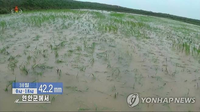 (서울=연합뉴스) 북한 조선중앙TV는 30일 주요 곡창지대인 황해남도 연안군의 한 협동농장에 침수된 논벼들의 모습을 방영했다. [조선중앙TV 화면] 2022.6.30