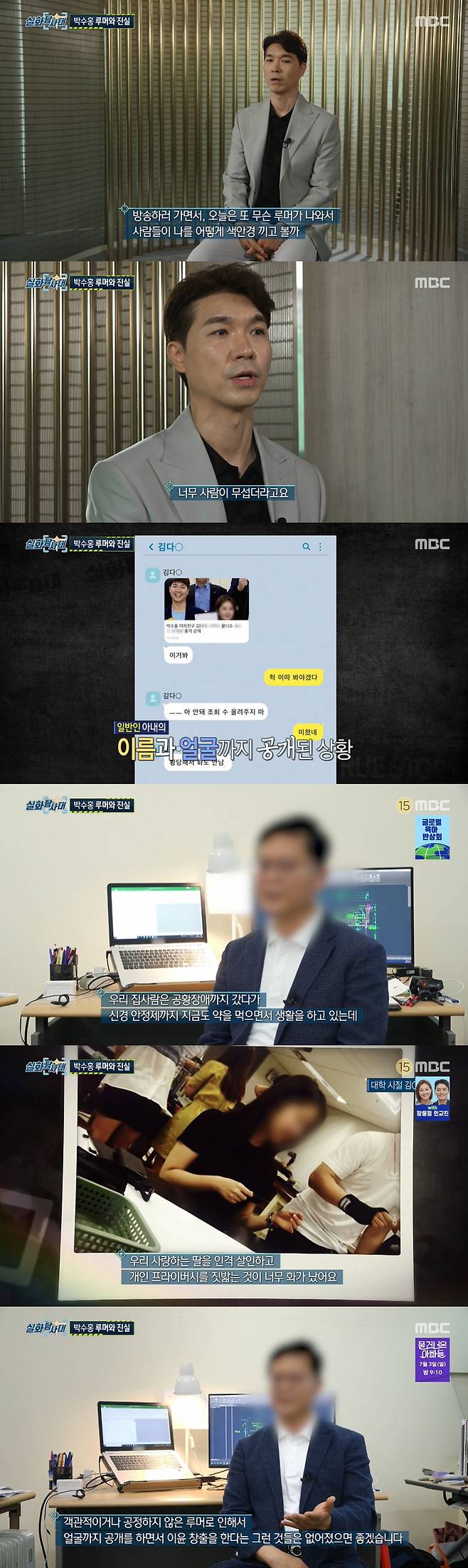 특히 박수홍은 유재석 등 지인들의 깜짝 응원 편지에 눈물을 흘렸다. 박수홍은 "지켜봐주셨던 분들이 힘을 내라고 응원의 글을 많은 분들이 올려주셨다"면서 "잘 살진 못했지만 부끄럽지 않게 살았다고 자부를 하는데 정말 그 글을 읽으면서 울면서 버텼다"고 밝혔다. 그는 "누군가가 이겨내면 그 다음 피해자가 없을 거고, 말도 안되는 거짓 속에서도 진실을 보게 되지 않을까 싶다. 작은 힘이지만 정말 노력하면서 살겠다"고 전했다.