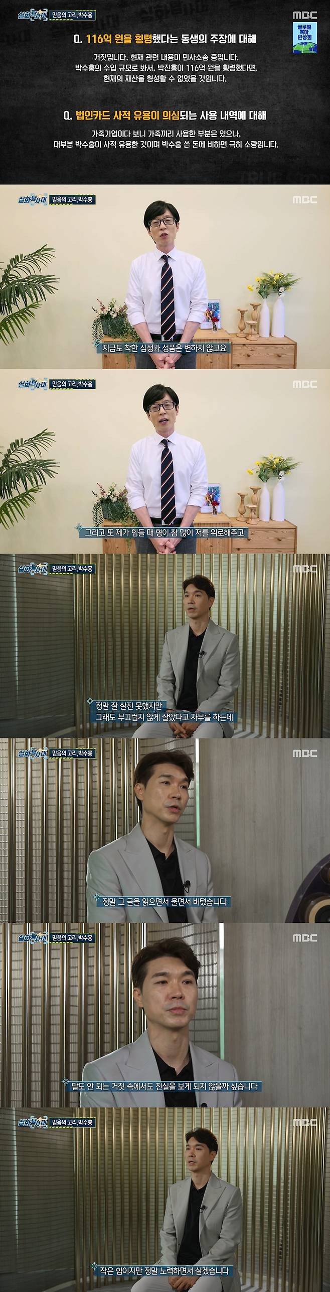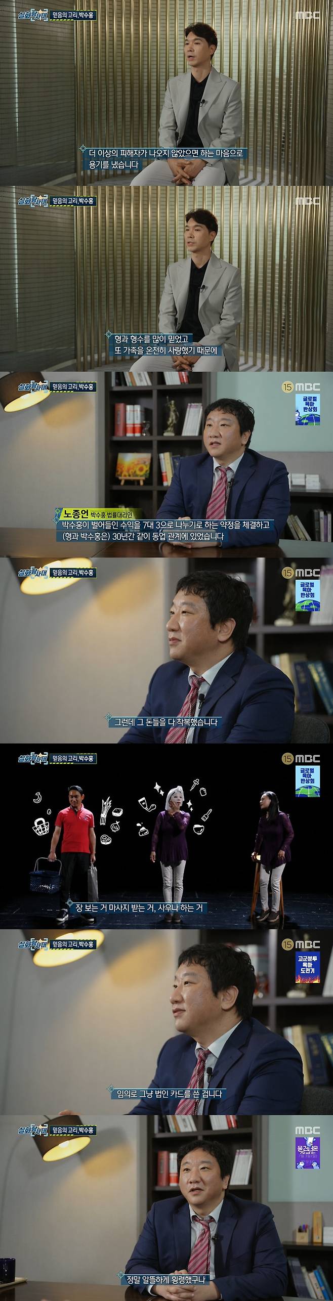 30일 방송된 MBC '실화탐사대'에서는 박수홍이 친형 가족과의 법적 다툼에 대한 심경을 밝혔다.