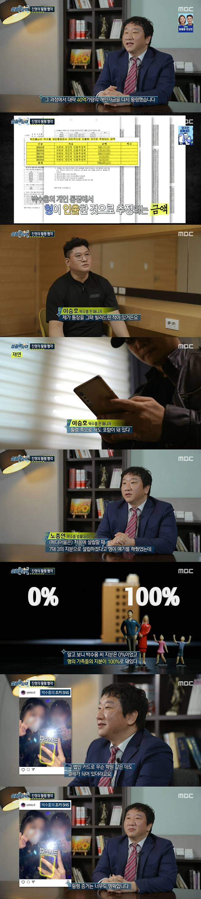 지난 10년간 형이 횡령한 금액은 116억원. 이 뿐만 아니라 근무 한 적 없는 직원에게 인건비가 지급된 내역도 확인됐다고. 박수홍의 전 매니저는 "통장을 빌려드린 적 있다. 검찰 쪽에서 횡령 쪽으로 저도 포함됐다면서 전화가 왔다"면서 "계좌를 뒤져봤더니 상암동 지점에서 현금지급기로 뺀 정황이 있더라. 3,4일을 계속 뺐더라"고 밝혔다.