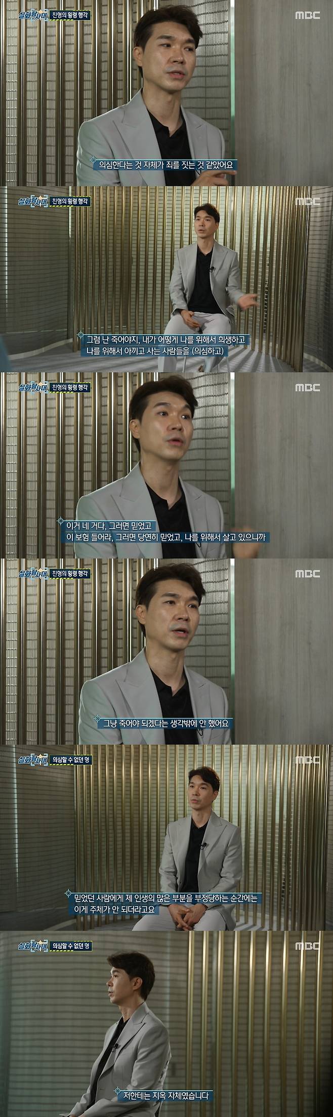박수홍은 "의심한다는 것 자체가 죄를 짓는 거 같았다. 내 형을 의심한다고? 그럼 난 죽어야지. 내가 어떻게 나를 위해 희생하고 나를 위해서 아끼고 사는 사람들에게 어떻게 통장을 보여달라고 하고"라며 "제가 바쁘게 살았지만 세상에 누군가는 믿고 살야아 하지 않냐"고 했다. 그는 "정말 믿었다. 이거 네거다 하면 믿었고, 이 보험 들어라고 하면 당연히 믿었고 나를 위해서 살고 있으니까"라면서 "그런데 뚜껑을 열어보니까 그냥 죽어야겠다는 생각 밖에 안했다"고 털어놨다. 박수홍은 "믿었던 사람에게 제 인생의 많은 부분을 부정당하는 순간에는 주체가 안되더라. 지옥 자체였다"고 했다.