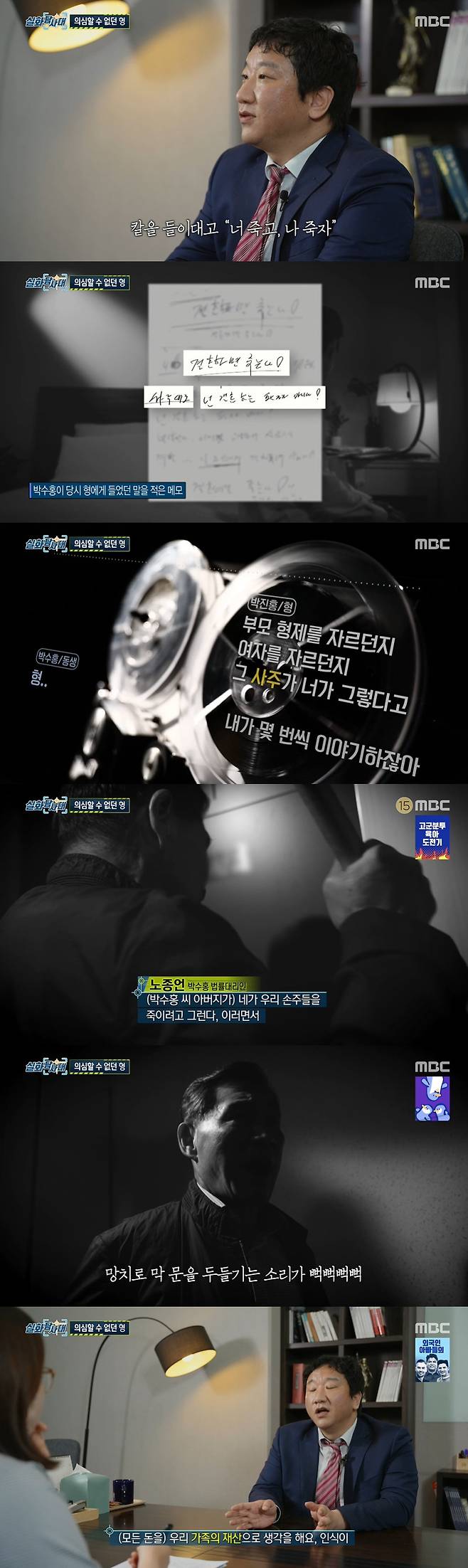 형이 주도하던 집안 상황. 법률 대리인은 "사주가 안 좋으니까 결혼하면 우리 집안을 망하게 할 수 있다. 칼을 들이대고 '너 죽고 나 죽자'"라면서 박수홍이 당시 형에게 들었던 말이 적힌 메모가 공개됐다.