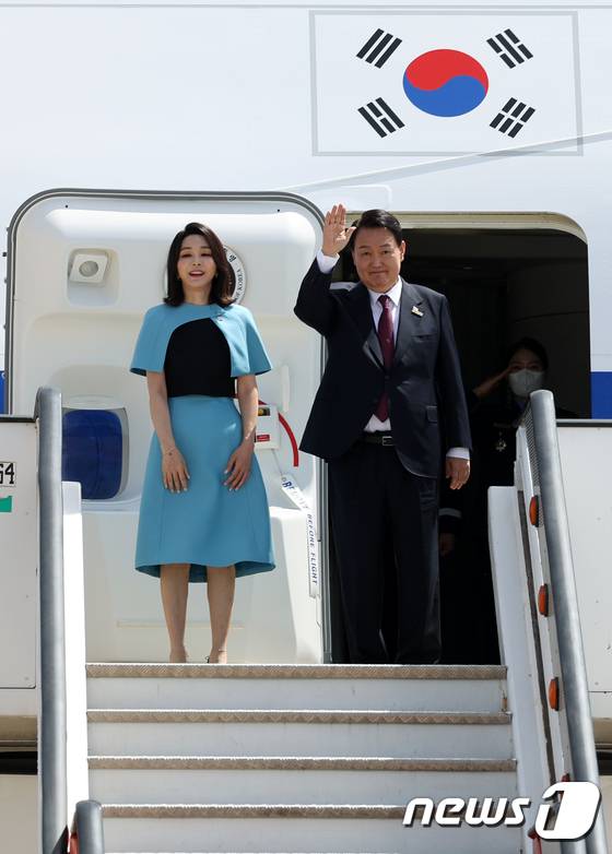 (마드리드=뉴스1) 오대일 기자 = 윤석열 대통령과 김건희 여사가 30일 오후(현지시간) 3박5일 동안 스페인 마드리드에서 열린 나토(NATO·북대서양조약기구) 정상회의 첫 순방을 마치고 마드리드 바라하스 국제공항에서 공군1호기에 탑승하며 손을 들어 인사하고 있다. (대통령실사진기자단) 2022.6.30/뉴스1