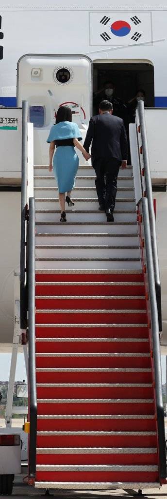 (마드리드=연합뉴스) 서명곤 기자 = 스페인 방문 일정을 마친 윤석열 대통령과 김건희 여사가 30일(현지시간) 마드리드 바라하스 국제공항에서 공군 1호기에 탑승하고 있다. 2022.6.30