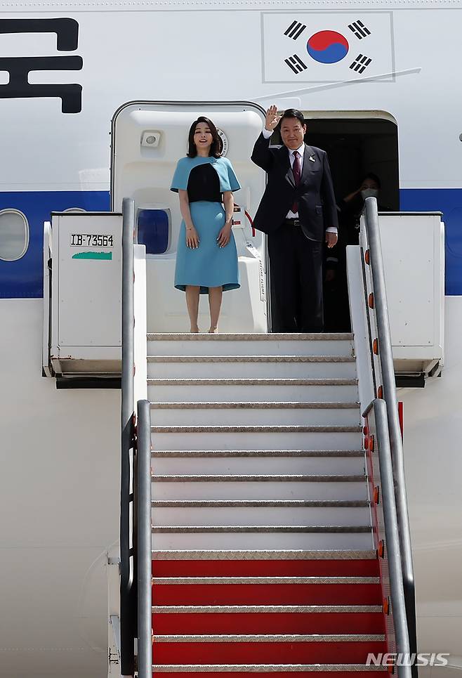 [마드리드=뉴시스] 전신 기자 = 첫 해외 순방 일정을 마친 윤석열 대통령과 부인 김건희 여사가 30일(현지시간) 마드리드 바라하스 국제공항에서 공군 1호기 탑승 전 손을 흔들어 인사하고 있다. (대통령실통신사진기자단) 2022.06.30. photo1006@newsis.com