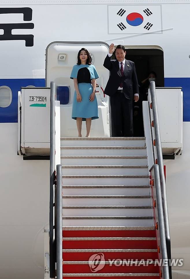 (마드리드=연합뉴스) 서명곤 기자 = 스페인 방문 일정을 마친 윤석열 대통령과 김건희 여사가 30일(현지시간) 마드리드 바라하스 국제공항에서 공군 1호기에 탑승해 손을 흔들고 있다. 2022.6.30