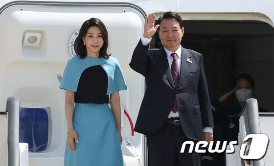 (마드리드=뉴스1) 오대일 기자 = 윤석열 대통령과 김건희 여사가 30일 오후(현지시간) 3박5일 동안 나토(NATO 북대서양조약기구) 정상회의 첫 순방을 마치고 스페인 마드리드 바라하스 국제공항에서 공군1호기에 탑승해 손을 들고 있다. (대통령실사진기자단) 2022.6.30/뉴스1