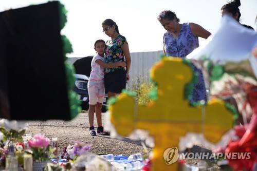 Mourners visit a makeshift memorial at the site where officials more than 50 people dead in an abandoned semitrailer containing suspected migrants, Thursday, June 30, 2022, in San Antonio. (AP Photo/Eric Gay)