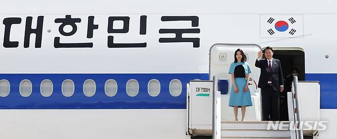 첫 해외 순방 일정 마치고 공군 1호기 오른 윤석열 대통령 내외