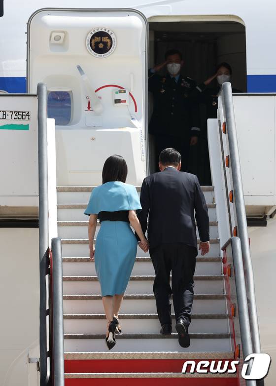 (마드리드=뉴스1) 오대일 기자 = 윤석열 대통령과 김건희 여사가 30일 오후(현지시간) 3박5일 동안 나토(NATO 북대서양조약기구) 정상회의 첫 순방을 마치고 스페인 마드리드 바라하스 국제공항에서 공군1호기에 탑승하고 있다. (대통령실사진기자단) 2022.6.30/뉴스1