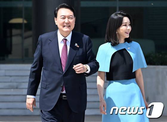 (마드리드=뉴스1) 오대일 기자 = 윤석열 대통령과 김건희 여사가 30일 오후(현지시간) 3박5일 동안 스페인 마드리드에서 열린 나토(NATO·북대서양조약기구) 정상회의 첫 순방을 마치고 바라하스 국제공항에서 공군1호기로 이동하며 이야기를 나누고 있다. (대통령실사진기자단) 2022.6.30/뉴스1