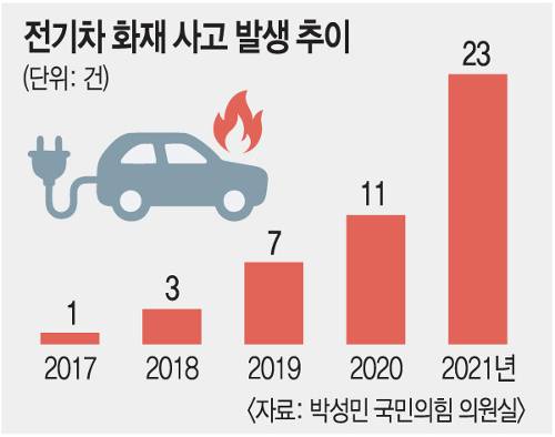 국토교통부에 등록한 전기차는 2017년 2만5108대에서 지난해 23만1443대로 10배 가까이 증가했다. 전기차가 도로에 많이 깔리면서 사고도 늘었다. 30일 박성민 국민의힘 의원실이 소방청으로부터 받은 자료에 따르면 전기차 화재 사고는 2017년 1건, 2018년 3건, 2019년 7건, 2020년 11건으로 꾸준히 늘다가 지난해 23건으로 급증했다.