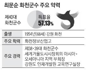 6·1 지방선거에서 당선되며 3선 고지에 오른 최문순 강원 화천군수는 30일 서울신문과 가진 인터뷰에서 이렇게 소감을 밝혔다. 이어 “선거 결과는 곧 민심의 발현이다. 다시 한번 군정을 맡겨 주신 것은 이 민심을 받들어 화천의 발전을 이루라는 무거운 명령이라고 생각한다”며 3선 군수로서의 책임감을 강조했다.