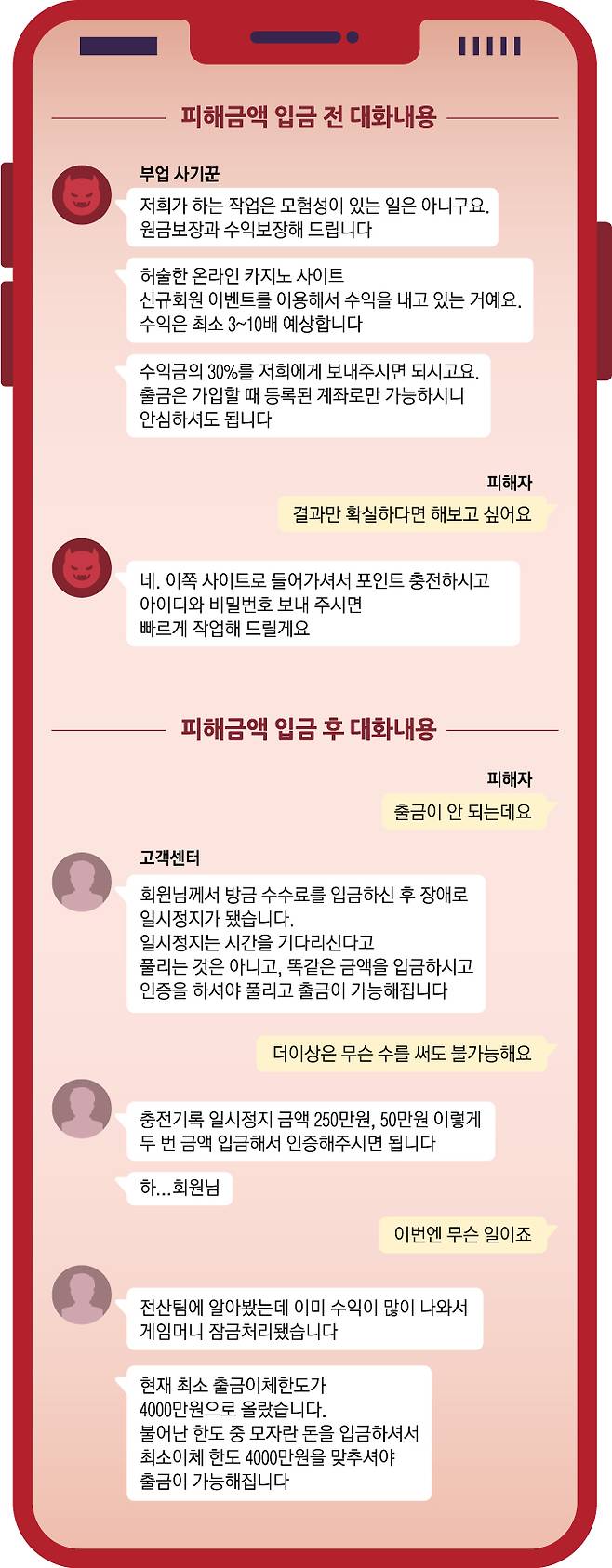 이후 안내원은 실제 수익이 발생했다며 곧 현금을 찾아갈 수 있다고 피해자에게 알렸다. 그러나 안내원은 이후 갖가지 이유를 대며 현금 인출이 어렵다고 둘러대기 시작했다. 수익금을 인출하려면 수수료와 가상계좌 개설 비용을 내야 한다는 식이었다. 그런 뒤에도 안내원은 “시스템에 일시적인 장애가 생겼다”, “보안시스템이 강화됐다”, “수익이 너무 많이 나서 게임머니 지급이 잠금 처리됐다”는 등의 이유를 대며 환급을 미뤘다. 이럴 때마다 안내원은 추가 입금을 요구했고 이 과정에서 A씨의 피해액은 4000만원까지 늘어났다.