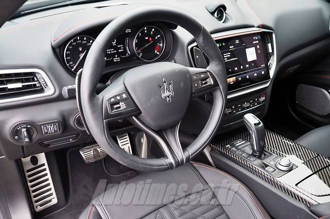 실내는 대칭 형태의 독창적인 대시보드가 신선하게 다가온다. 고급스러운 감각에 모든 초점을 맞췄고 투톤 가죽을 감싸 밋밋함도 피했다. 이와 함께 스포츠 스티어링 휠의 알루미늄 기어 시프트 패들과 이녹스 스포츠 페달 등에서 마세라티 특유의 디테일에 대한 열정을 느낄 수 있다.