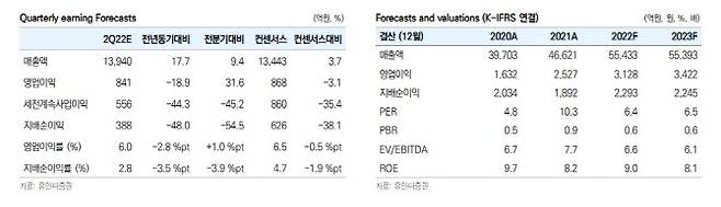 2분기 예상 실적은 매출액 1조4000억원, 영업이익 841억원(영업이익률 6.0%), 지배주주 순이익 388억원 등이다. 영업이익 추정치는 전년 동기 1036억원 대비 19% 줄어들지만, 지난 4분기 27억원으로 바닥을 확인 후 1분기 639억원에 이어 2개 분기 연속 회복하는 것이다. 패션·산업자재·화학부문은 전분기 대비 증익이 예상된다. 부문별 영업이익은 산업자재 479억원(전분기 379억원, 타이어코드), 패션 229억원(전분기 154억원, 골프웨어), 화학 132억원(전분기 108억원, 석유수지), 필름·전자재료 마이너스(-)27억원(전분기 13억원) 등이다.