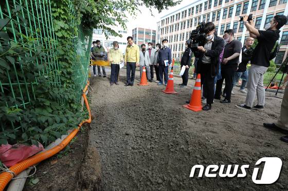 (서울=뉴스1) 허경 기자 = 오세훈 서울시장이 1일 서울 종로구 경신고등학교를 찾아 폭우 피해 현장을 둘러보고 있다. 2022.7.1/뉴스1