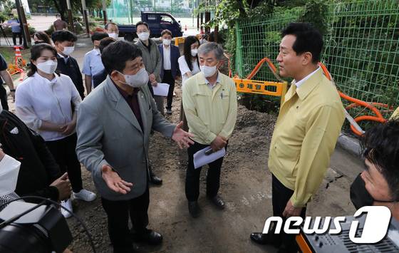 (서울=뉴스1) 허경 기자 = 오세훈 서울시장이 1일 서울 종로구 경신고등학교를 찾아 폭우 피해 현장을 둘러보고 있다. 2022.7.1/뉴스1