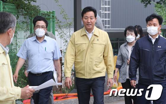 (서울=뉴스1) 허경 기자 = 오세훈 서울시장이 1일 서울 종로구 경신고등학교를 찾아 폭우 피해 현장을 둘러보고 있다. 2022.7.1/뉴스1