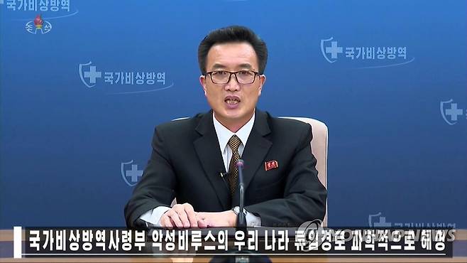 조선중앙TV는 1일 국가비상방역사령부의 조사결과를 인용해 "4월 중순경 강원도 금강군 이포리 지역에서 수도로 올라오던 여러명의 인원들 중에서 발열증상이 나타나기 시작했다"며 "이들과 접촉한 사람들 속에서 유열자들이 급증했고 이포리 지역에서 처음으로 유열자들이 집단적으로 발생했다"고 보도했다. 사진은 국가비상방역사령부 관계자인 류영철이 브리핑하는 모습. [조선중앙TV 화면] 2022.7.1