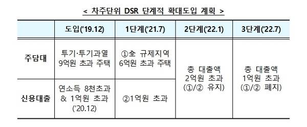 현행 DSR 규제(2단계)는 총 대출액이 2억원이 넘으면 연간 원리금 상환액이 연 소득의 40%(2금융권은 50%)를 넘지 않도록 하고 있다. 그런데 7월부터는 DSR 적용 대상이 총 대출액 1억원 초과 차주로 확대된다. 관련 규제가 이전보다 더 강화되는 셈이다.