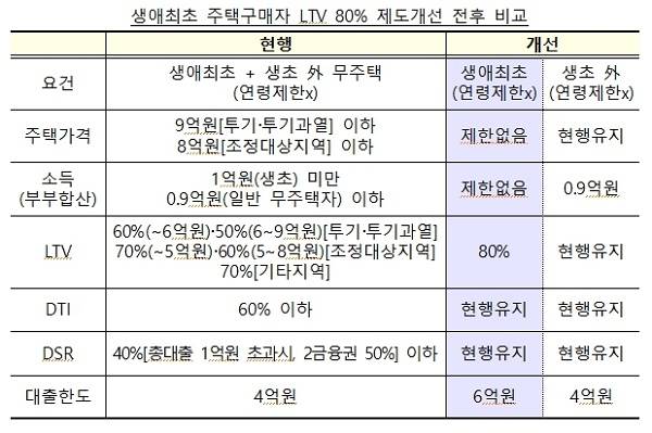 정부는 지난달 16일 발표한 경제정책방향에서 3분기부터 생애 최초 주택 구매자의 주택담보인정비율(LTV)을 지역과 집값, 소득 등과 상관없이 80%로 완화하겠다고 밝혔다.