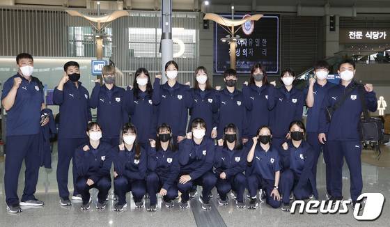(인천공항=뉴스1) 권현진 기자 = 어창선 감독을 비롯한 여자 20세이하청소년대표팀(U20 대표팀)이 1일 인천국제공항을 통해 카자흐스탄으로 출국하기 전 파이팅을 외치고 있다.