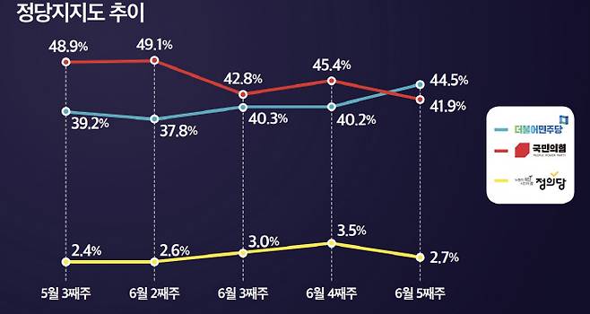 1일 여론조사 전문기관 '미디어토마토'가 지난달 28~29일 만 18세 이상 전국 성인남녀 1030명을 대상으로 실시한 여론조사 결과에 따르면, 정당 지지도에서 민주당 44.5%, 국민의힘 41.9%, 정의당 2.7% 순으로 나타났다. 민주당은 지난주 대비 40.2%에서 44.5%로 4.3%포인트 상승했다. 같은 기간 국민의힘은 45.4%에서 41.9%로 3.5%포인트 하락해 희비가 엇갈렸다.