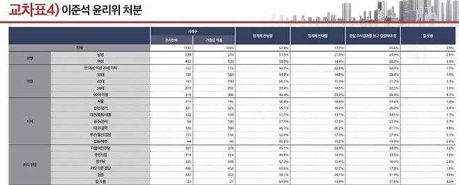 이번 여론조사에서 이 대표에 대한 징계에 찬성한다는 응답이 53.8%였다. 경찰 수사결과를 보고 결정해야 한다는 응답이 25.5%, 이 대표의 징계에 반대한다는 응답은 17.7%였다. 그러나 정당별로 볼 때 의미해석이 달라진다. 국민의힘 지지층에서도 징계에 찬성한다는 응답이 38.1%로 가장 높았지만, 수사결과를 보고 결정해야 한다는 의견이 31.9%, 징계에 반대한다는 의견도 26.1%를 차지했다. 국민의힘 지지층 절반 이상이 이 대표에 대한 징계에 반대하거나 신중해야 한다는 입장을 보였다.