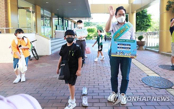 (전주=연합뉴스) 서거석 전북교육감이 임기 첫날인 1일 전주시 우림초등학교에서 학생들 등교지도를 하고 있다. 2022.7.1 [전북도교육청 제공. 재판매 및 DB 금지]