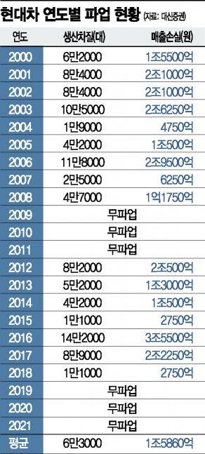 대신증권에 따르면 2000년부터 지난해까지 현대차 노조 파업 시 연평균 6만3000대의 생산 차질을 보였다.