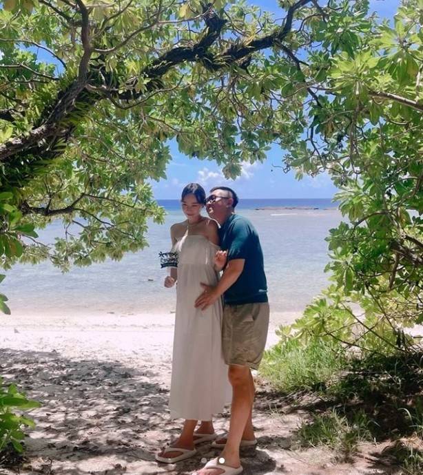 괌의 아름다운 해변을 배경으로 안일권은 아내의 배에 손을 얹고 행복한 표정을 짓고 있다.