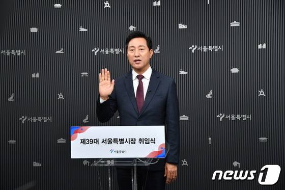 (서울=뉴스1) = 오세훈 서울시장이 1일 오전 온라인으로 가진 취임식에서 취임 선서를 하고 있다. (서울시 제공) 2022.7.1/뉴스1