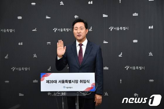 (서울=뉴스1) = 오세훈 서울시장이 1일 오전 온라인으로 가진 취임식에서 취임 선서를 하고 있다. (서울시 제공) 2022.7.1/뉴스1
