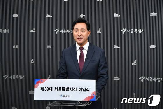 (서울=뉴스1) = 오세훈 서울시장이 1일 오전 온라인으로 가진 취임식에서 취임사를 하고 있다. (서울시 제공) 2022.7.1/뉴스1