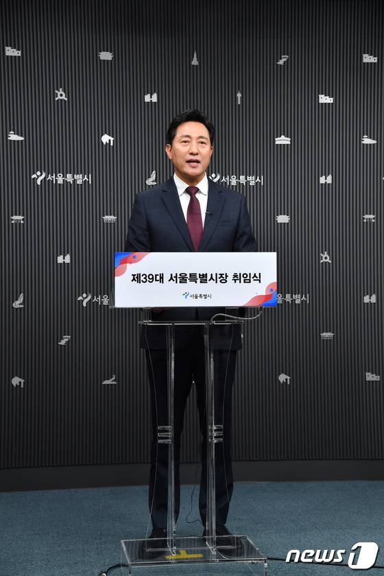 (서울=뉴스1) = 오세훈 서울시장이 1일 오전 온라인으로 가진 취임식에서 취임사를 하고 있다. (서울시 제공) 2022.7.1/뉴스1