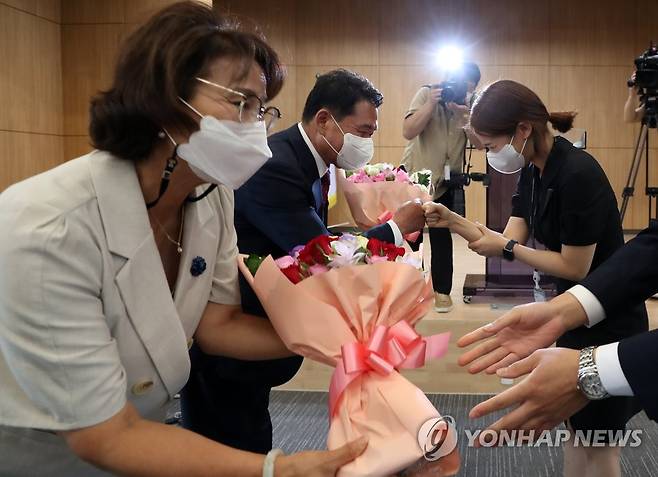 (춘천=연합뉴스) 양지웅 기자 = 신경호 신임 강원도교육감이 1일 오전 강원 춘천시 강원도교육청에서 열린 취임식에서 아내와 함께 축하 꽃다발을 받고 있다. 2022.7.1
