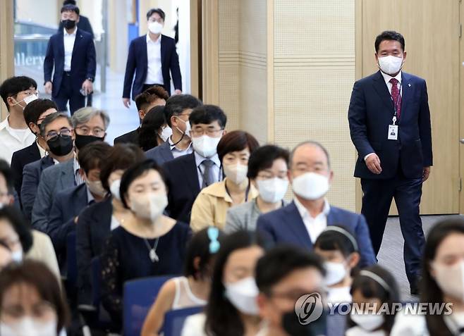 (춘천=연합뉴스) 양지웅 기자 = 신경호 신임 강원도교육감이 1일 오전 강원 춘천시 강원도교육청에서 열린 취임식에 참석하고 있다. 2022.7.1
