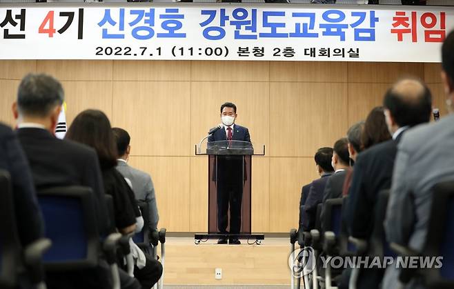 (춘천=연합뉴스) 양지웅 기자 = 신경호 신임 강원도교육감이 1일 오전 강원 춘천시 강원도교육청에서 열린 취임식에서 취임사를 하고 있다. 2022.7.1
