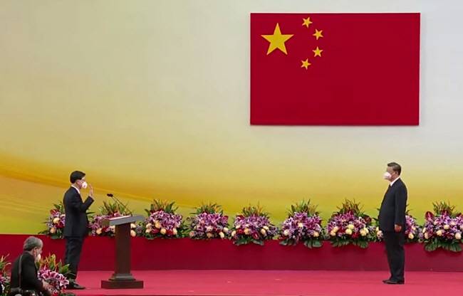 존 리(왼쪽) 홍콩 신임 행정장관이 1일 홍콩 완차이 홍콩컨벤션센터에서 홍콩의 중국 반환 25주년에 열린 취임식에서 시진핑 중국 국가주석 앞에서 취임 선서를 하고 있다. 전날 5년 만에 홍콩을 찾은 시 주석은 ‘일국양제’를 강조하면서 현재의 강압 통치 방식을 이어갈 뜻을 분명히 했다. 사우스차이나 모닝포스트 유튜브 화면 캡처