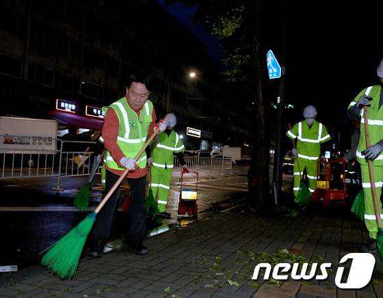 (서울=뉴스1) = 이성헌 서대문구청장(왼쪽)이 민선 8기 첫날인 1일 새벽 서울 서대문구 인왕시장길을 찾아 폭우로 거리에 떨어진 낙엽을 쓸며 환경미화원들과 함께 거리 청소를 하고 있다. (서대문구청 제공) 2022.7.1/뉴스1