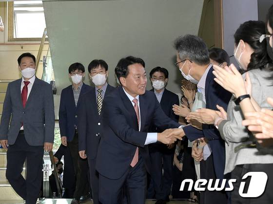 (서울=뉴스1) = 이성헌 서대문구청장이 민선 8기 첫날인 1일 오전 서울 서대문구 구청에서 직원들과 인사를 하고 있다.(서대문구 제공) 2022.7.1/뉴스1
