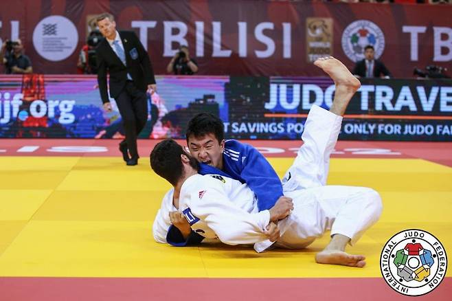 (서울=연합뉴스) 이준환(20·용인대)이 지난 26일 몽골 울란바토르에서 열린 국제유도연맹(IJF) 2022 그랜드슬램 남자 81㎏급에서 2020 도쿄올림픽 금메달리스트 나가세 다카노리(29·일본), 동메달리스트 샤밀 보르하슈빌리(27·오스트리아)를 연거푸 꺾고 우승을 차지했다. 사진은 유도 대표팀 이준환 경기 모습. 2022.7.1 [IJF 홈페이지 캡처. 재배포 및 DB 금지]