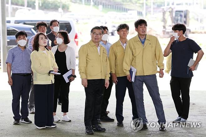 (서울=연합뉴스) 임헌정 기자 = 이틀 전부터 중부지방 중심으로 쏟아진 폭우가 멈춘 1일 서울 중랑구 중랑천 둔치에서 류경기 중랑구청장이 폭우 피해상황을 점검하고 있다. 2022.7.1