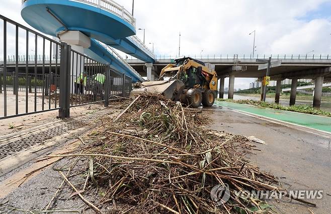 (서울=연합뉴스) 임헌정 기자 = 이틀 전부터 중부지방 중심으로 쏟아진 폭우가 멈춘 1일 서울 중랑구 중랑천 둔치에서 관계자들이 청소작업을 하고 있다. 2022.7.1