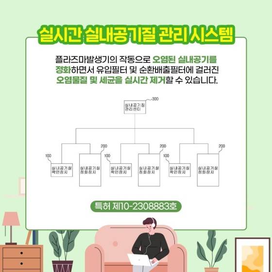◆ 실내공기질 관리 장치 (특허 제10-2338034호) 실외 환기가 가능한 정화 구조와 실내 정화 구조를 연동하여 매우 효과적으로 실내 공기질을 향상시킬 수 있습니다.