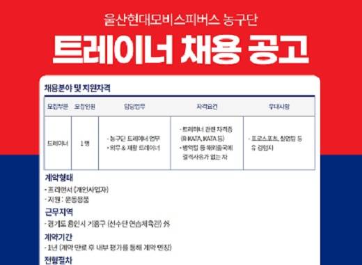 현대모비스는 1일 "트레이너는 선수와 원활한 커뮤니케이션을 중요시하며 훈련 프로그램 운영, 병력 관리 등 선수단 전체 컨디션 관리 업무를 담당하게 된다. 지원자격은 트레이너 관련 자격증 보유자에 한하며, 해외출국에 결격사유가 없어야 한다"라고 밝혔다.