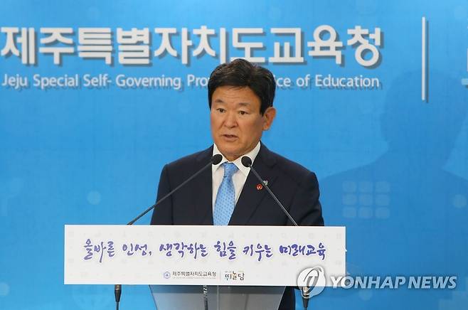 (제주=연합뉴스) 전지혜 기자 = 김광수 신임 제주도교육감이 1일 오후 제주도교육청 기자실에서 기자회견을 열어 취임 포부와 공약 과제 등을 밝히고 있다. 2022.7.1