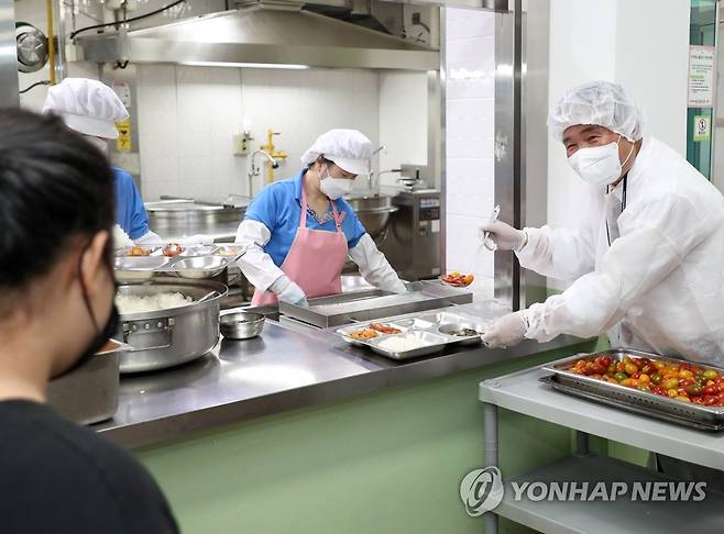 (춘천=연합뉴스) 양지웅 기자 = 신경호 신임 강원도교육감이 1일 오전 강원 춘천시 동원학교에서 특수교육 대상 학생들을 위해 배식 봉사를 하고 있다. 2022.7.1